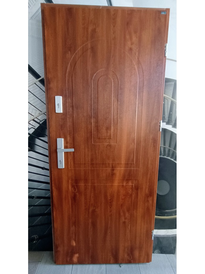 Drzwi Wikęd Premium 80N P zewnętrzne do domów i mieszkań. Kolor złoty dąb, wymiar zewnętrzny 90/207. ościeżnica stalowa kątowa 9 cm, klamka , kpl. wkładek